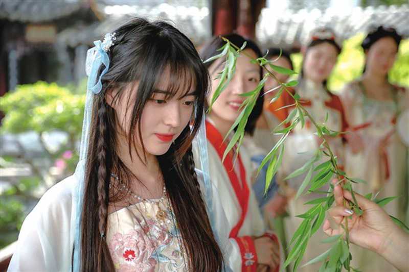 當(dāng)天,在袁學(xué)瀾故居的水渠邊,一群身穿漢服的小姑娘以珍盤盛水,用柳枝蘸水灑向?qū)Ψ?,看起來像是一場小型的“潑水?jié)”?!斑@叫祓禊之儀?!眳⑴c者告訴記者,在上巳節(jié)的傳統(tǒng)習(xí)俗中,這是一種消災(zāi)求福的儀式,即三五好友用新出的柳枝灑水,寓意洗去身體的污穢,去除不祥。禮罷,漢服姑娘圍坐在水渠邊,將酒杯置于上游,任其順著曲折的水流緩緩漂浮,還原“曲水流觴”的浪漫趣事。