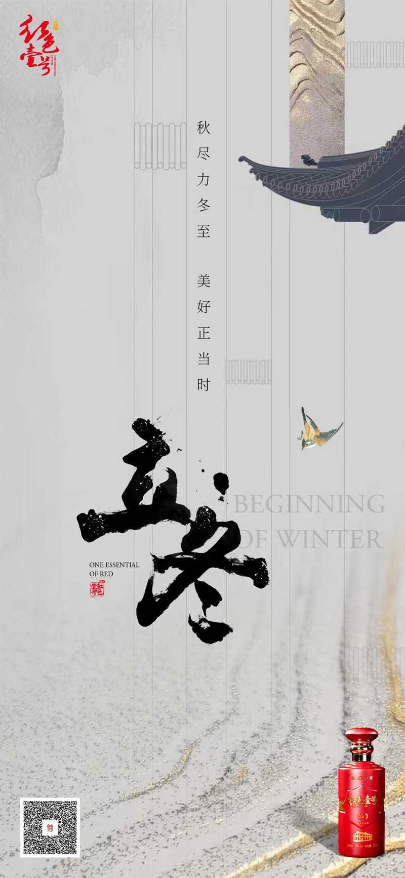 立,建始也;立冬,表示冬季自此開始。立冬與立春、立夏、立秋合稱四立,在中國古代是個(gè)重要的節(jié)日。立冬節(jié)氣,水始凍,地始凍,農(nóng)事結(jié)束。辛苦一年酒師們把新釀的紅色壹號(hào)和茅臺(tái)醬香酒儲(chǔ)存到陶制酒壇,然而這并沒有結(jié)束。新酒將在陶壇中繼續(xù)呼吸、生長、成熟、老化,直到慢慢變得醇厚濃香。