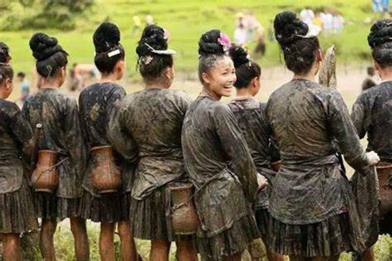 打泥巴仗:貴州東南部一帶的侗族青年男女,每年芒種前后都要舉辦打泥巴仗節(jié)。當(dāng)天,新婚夫婦由要好的男女青年陪同,集體插秧,邊插秧邊打鬧,互扔泥巴?;顒咏Y(jié)束,檢查戰(zhàn)果,身上泥巴最多的,就是最受歡迎的人。