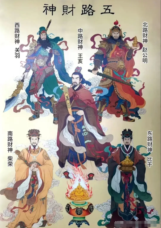 4、正月初五迎財(cái)神。初五是財(cái)神的生日,因此,民間在初五迎財(cái)神。中國(guó)民間傳說(shuō),財(cái)神即五路神。所謂五路,指東西南北中,意為出門(mén)五路,皆可得財(cái)。
