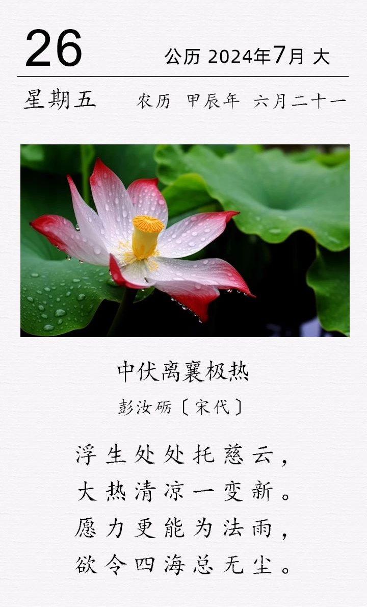 “浮生處處托慈云,大熱清涼一變新?!币欢涫钦f,人生處處,需要依托,慈心廣大的佛。將酷熱難耐的中伏天,一下子變得清涼無限。這是寫“中伏之炎熱”。
