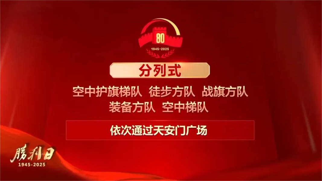 分列式環(huán)節(jié),按空中護(hù)旗梯隊(duì)、徒步方隊(duì)、戰(zhàn)旗方隊(duì)、裝備方隊(duì)、空中梯隊(duì)的順序,依次通過(guò)天安門廣場(chǎng)。